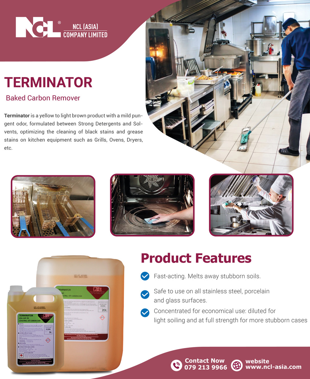 Terminator is a specialized cleaning chemical that helps remove all stubborn stains, grease, and scorch marks on the oven and kitchen utensils quickly and effectively: