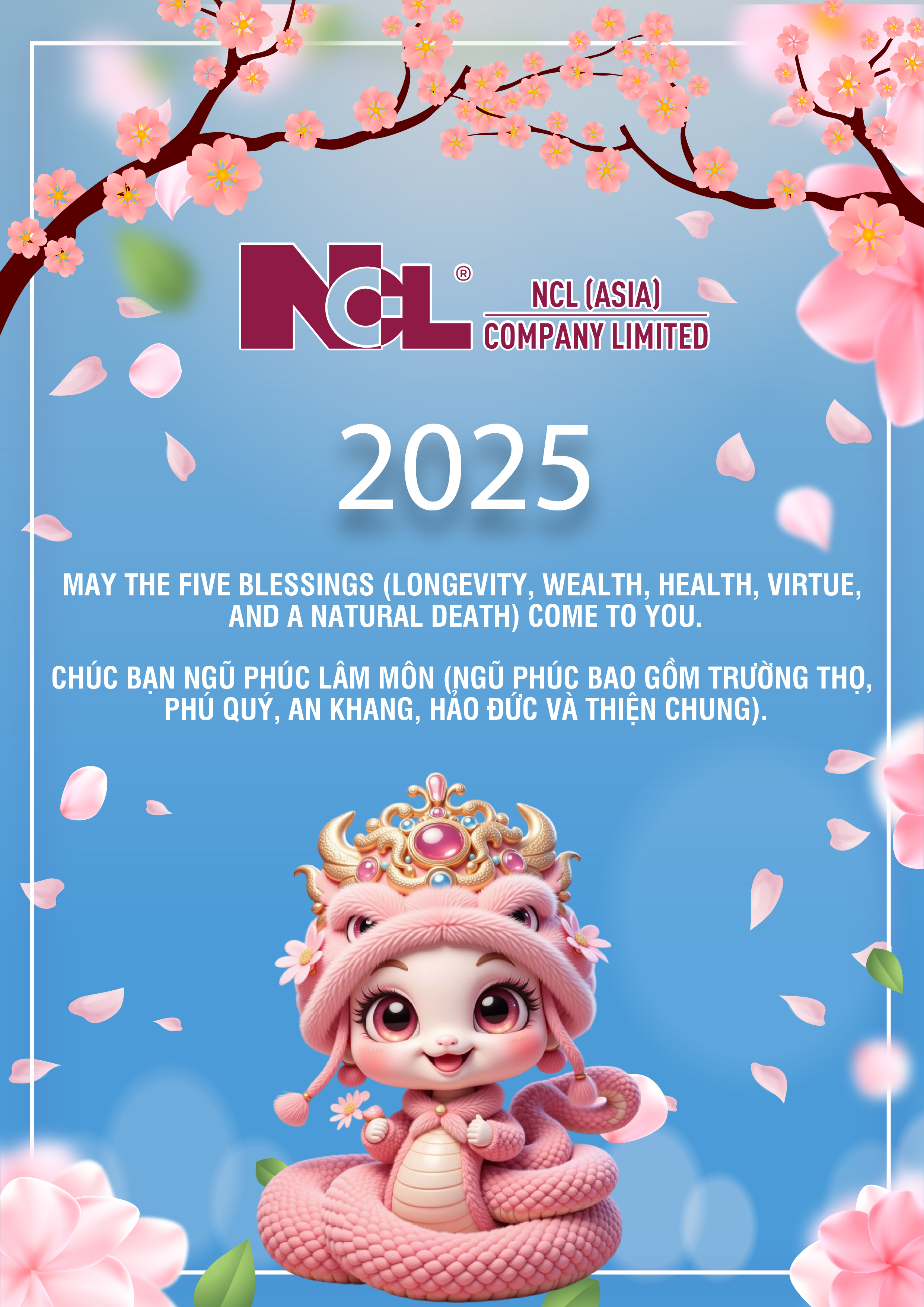Một năm cũ đã khép lại, mở ra một năm mới với nhiều cơ hội và thịnh vượng! Nhân dịp xuân ẤT TỴ 2025, NCL Á Châu xin gửi lời chúc SỨC KHỎE – AN KHANG – THỊNH VƯỢNG đến quý khách hàng, đối tác và toàn thể mọi người!