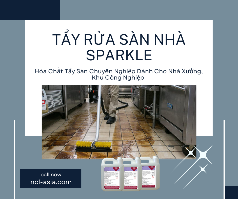 Giới thiệu hóa chất tẩy rửa sàn nhà chuyên nghiệp - Sparkle. Sparkle là dung dịch màu xanh ngọc, mùi trà xanh, được NCL hỗn hợp hoá từ Chất Hoạt Động Bề Mặt Anionic, Non-Ionic, dùng để vệ sinh các Khu Vực Công Cộng như Lối Đi Nhà Ga, Bệnh Viện, Trường Học; các Khu Vực Sàn Nấu Ăn Khu Chuẩn Bị Thực Phẩm hay Nhà Chứa, Nhà Kho.