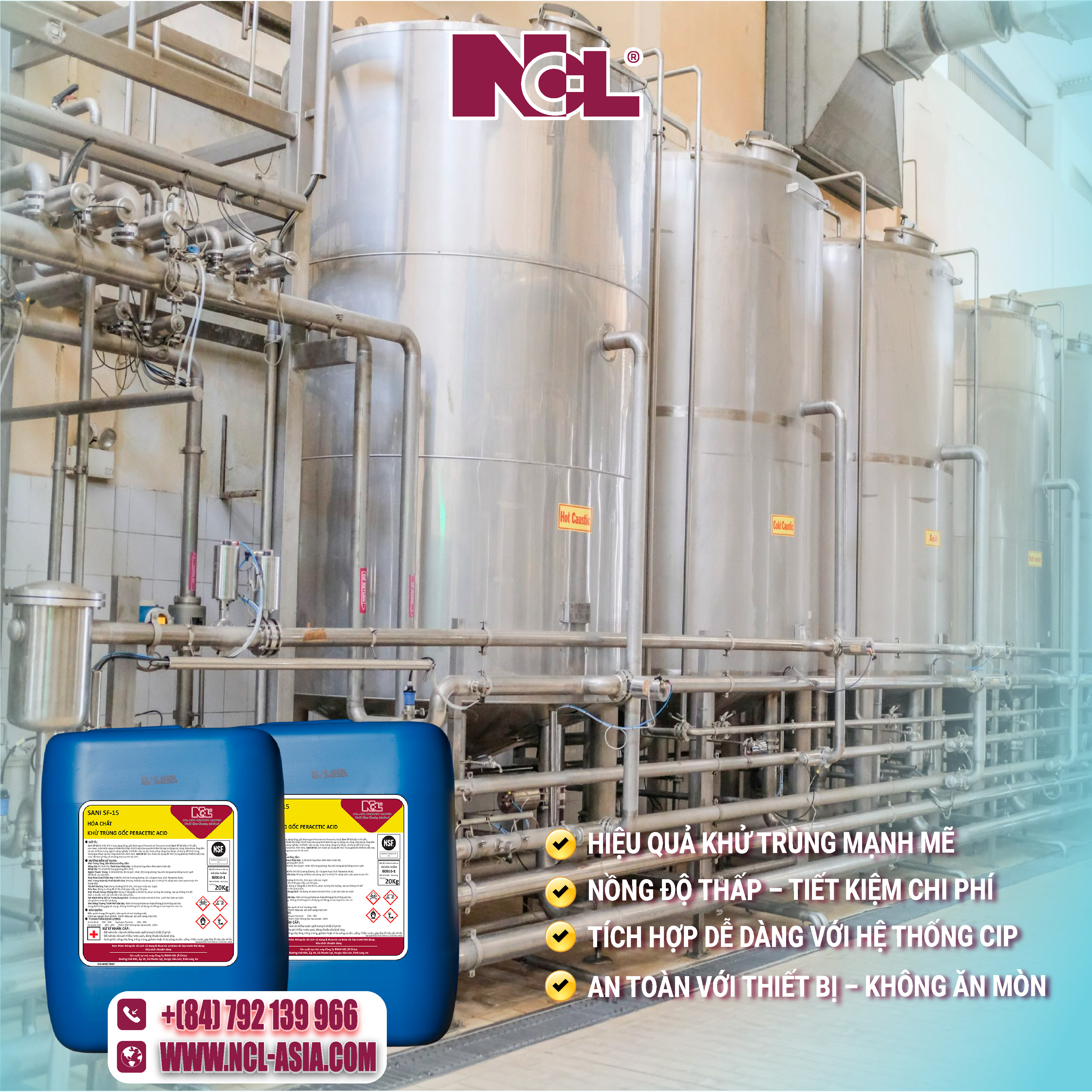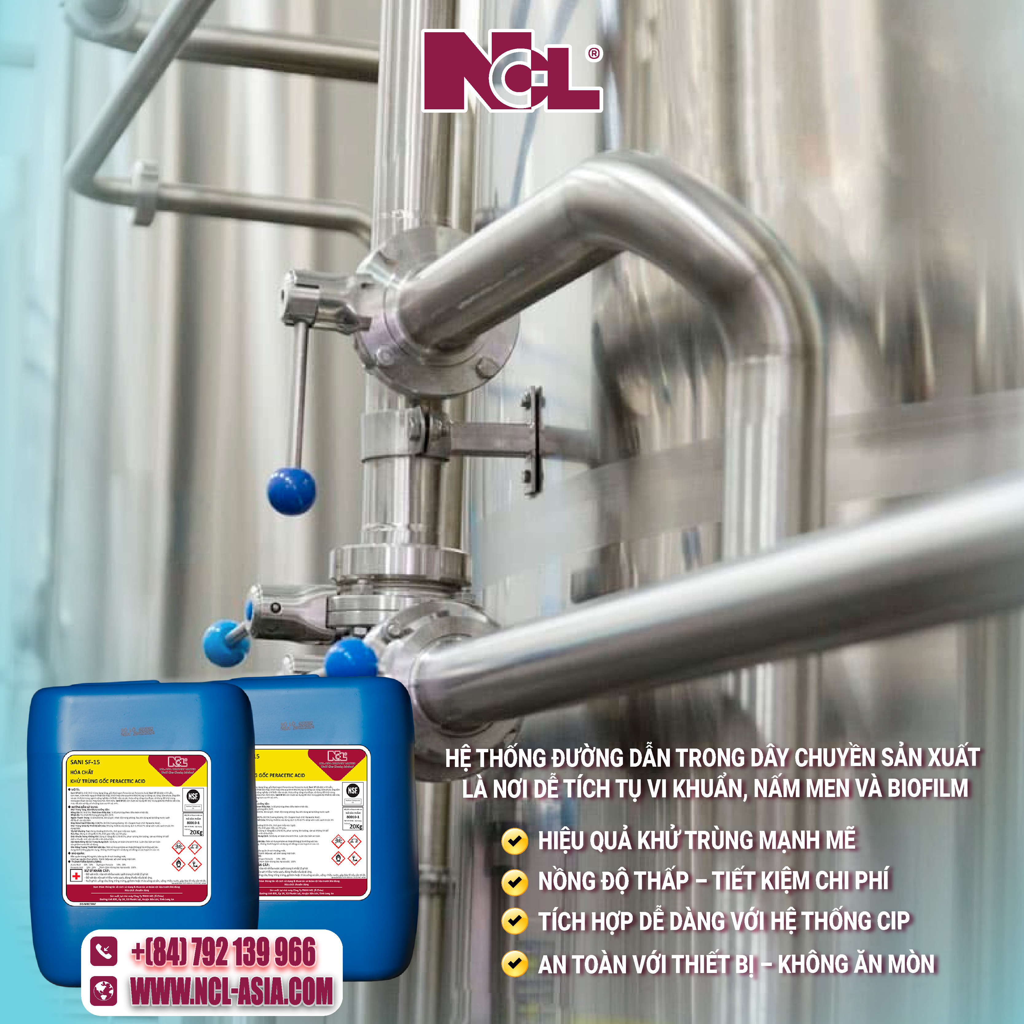 Trong dây chuyền sản xuất thực phẩm và đồ uống, bồn chứa và ống dẫn là khu vực dễ phát sinh vi sinh vật gây hại nếu không được vệ sinh đúng cách. Với SANI SF-15, mọi nỗi lo về vi khuẩn và tồn dư hóa chất được loại bỏ chỉ trong một bước.