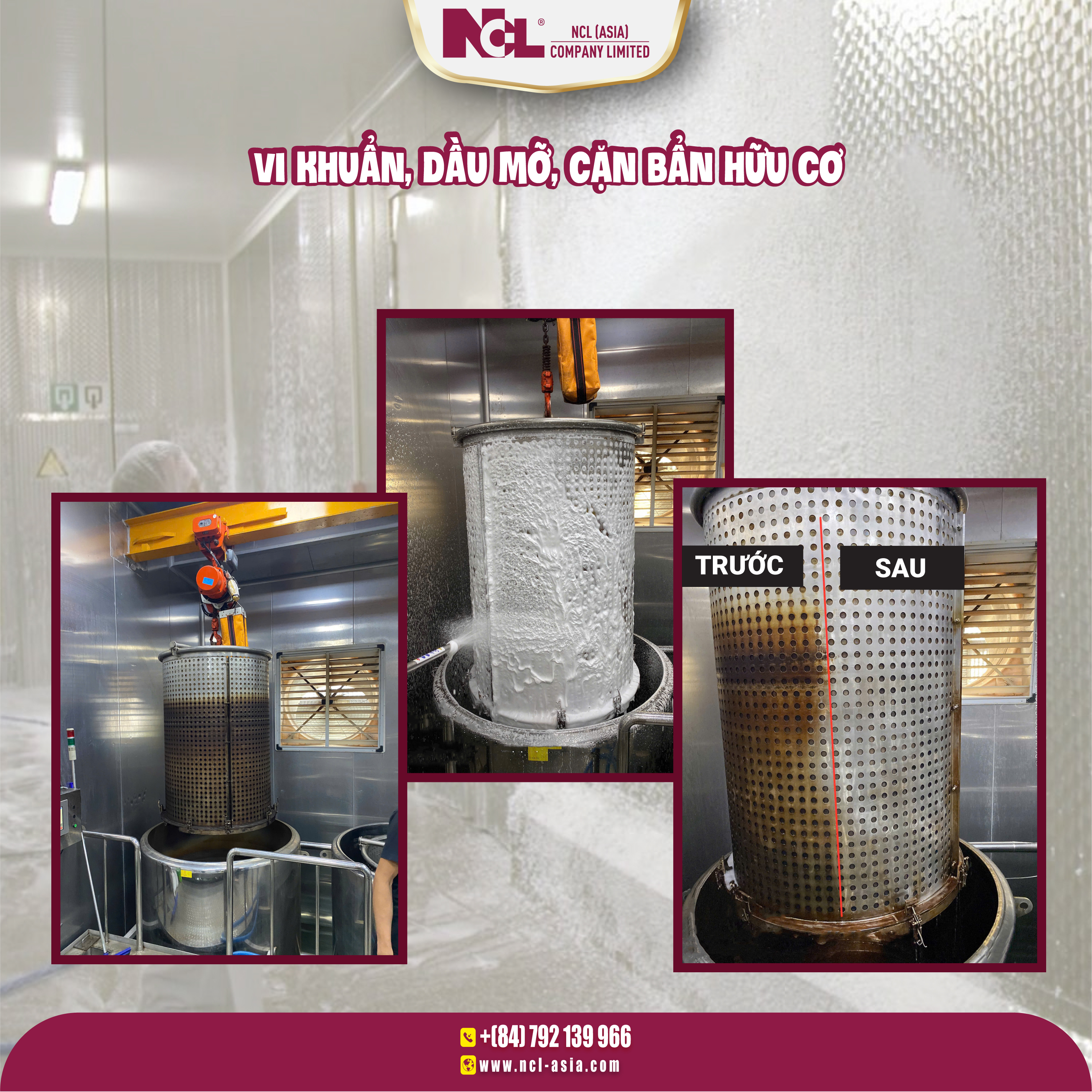 Đánh bay dầu mỡ, cặn bẩn hữu cơ, vi khuẩn trên dây chuyền sản xuất, máy móc, sàn nhà.
