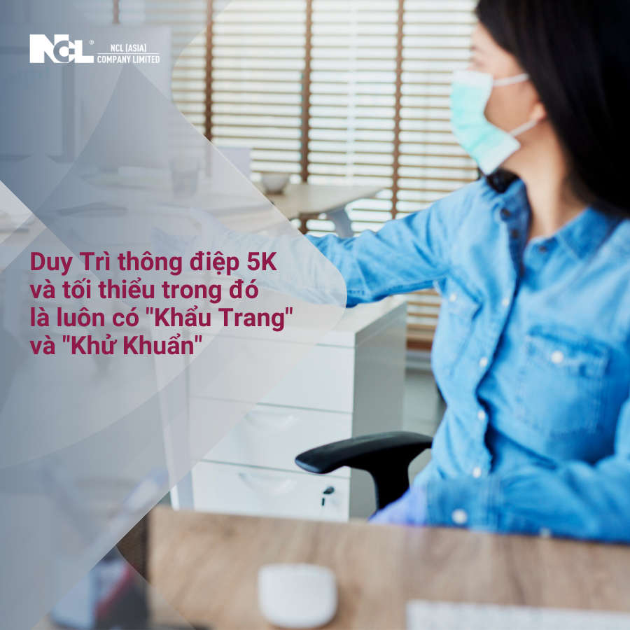 Đảm bảo một môi trường an toàn và yên tâm để làm việc, tập trung vào các khu vực tiếp xúc nhiều trong ngày, kiểm tra thường xuyên và củng cố các nguyên tắc mới khi nhân viên quay lại không gian làm việc của họ hướng dẫn mọi người giữ vệ sinh - ví dụ: nhắc họ rửa và vệ sinh tay - đảm bảo họ đảm bảo được 5K khi đi ra khỏi văn phòng và trở lại.